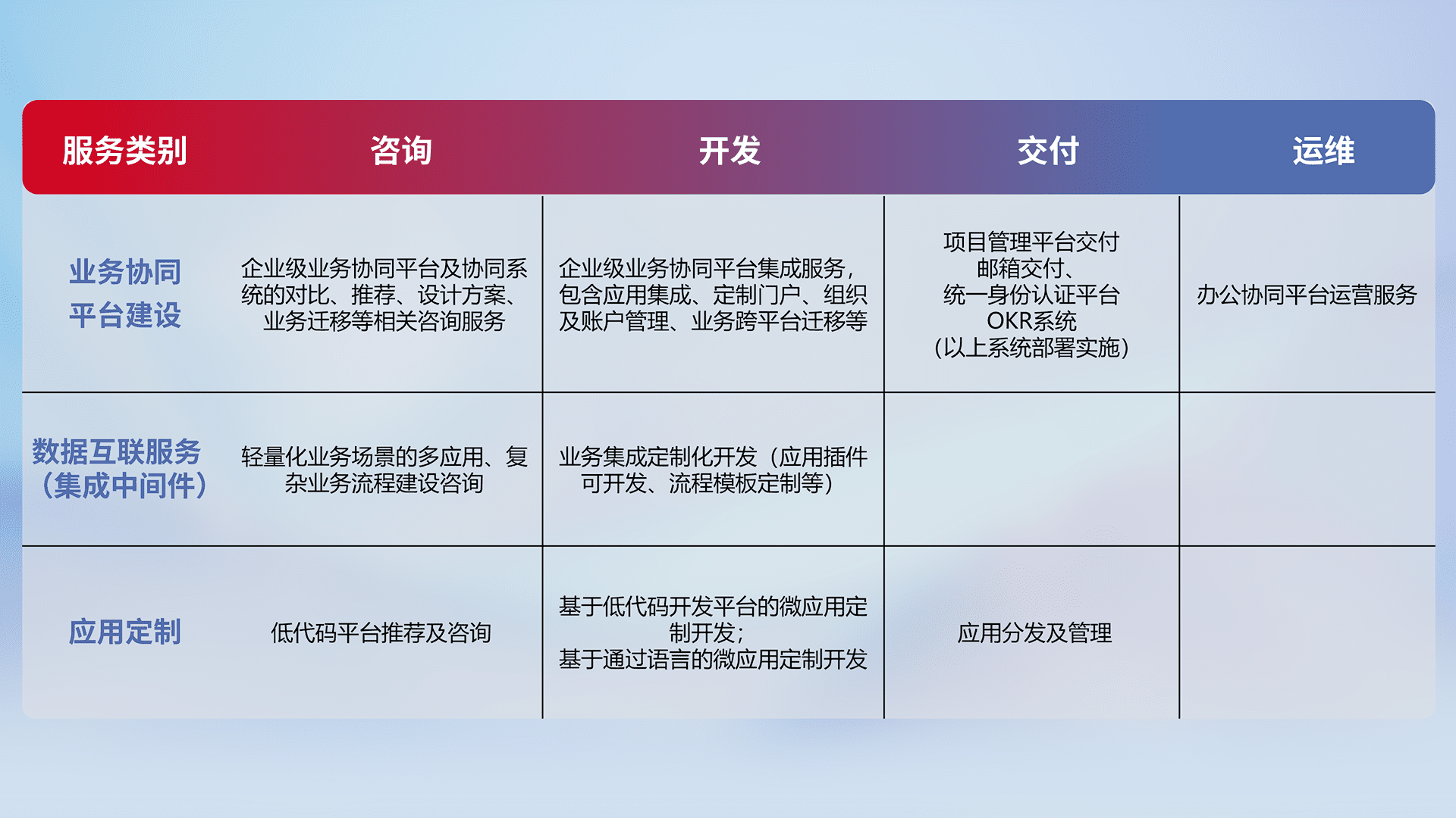 针对钉钉、、企微、、、IDaas等平台级产品提供产品的规划、、、方案、、、交付、、、、定制化开发等服务,,实现如统一协同办公、、、、智能客户服务、、混合会议管理、、、智能数据查询、、、等业务场景,,,实现数字化转型。。。